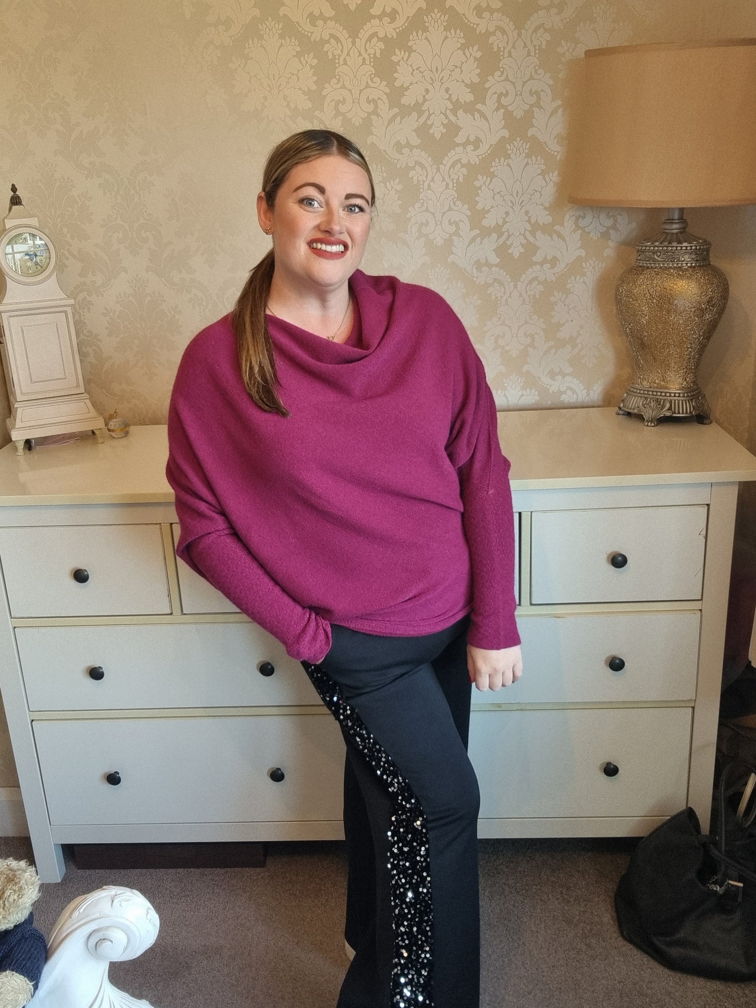 Lovely and soft, elasticated waist trousers with sequin stripe down the side. Also has pockets. One size, fit's up to size 18.