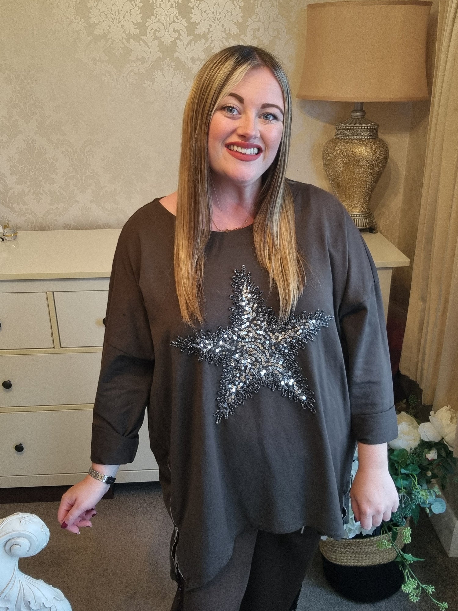 Lovely oversized style, star detailed sweatshirt with zip sides. One size, fit's up to size 20