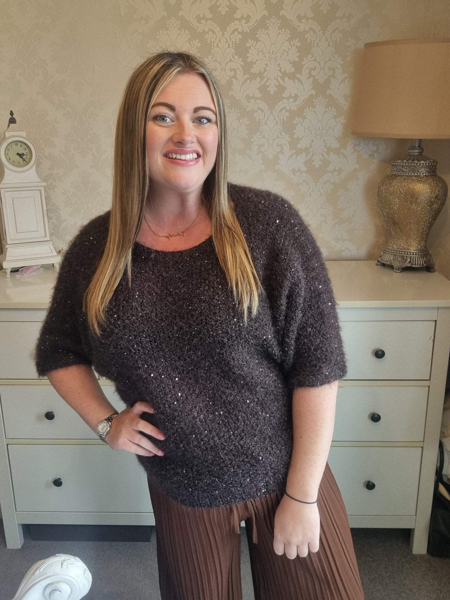 Elasticated waist, pleated wide leg trousers. One size, fit's up to size 16/18.