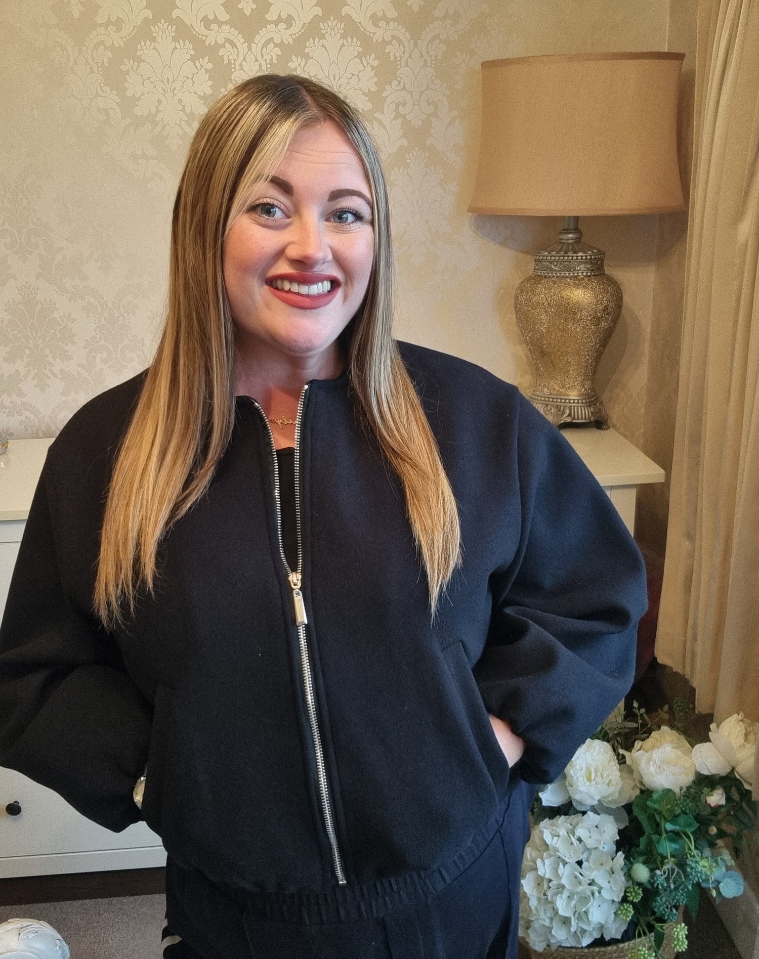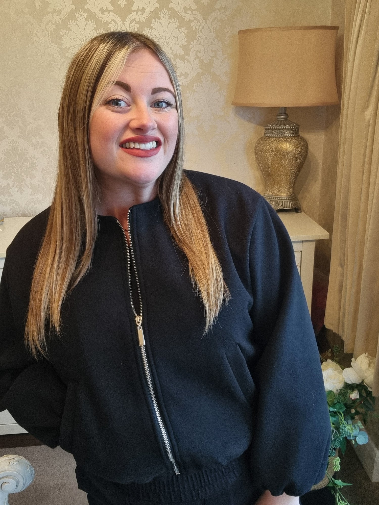 Lovely little jacket with bubble hem bottom. Has pockets, one size, fit's up to size 16.